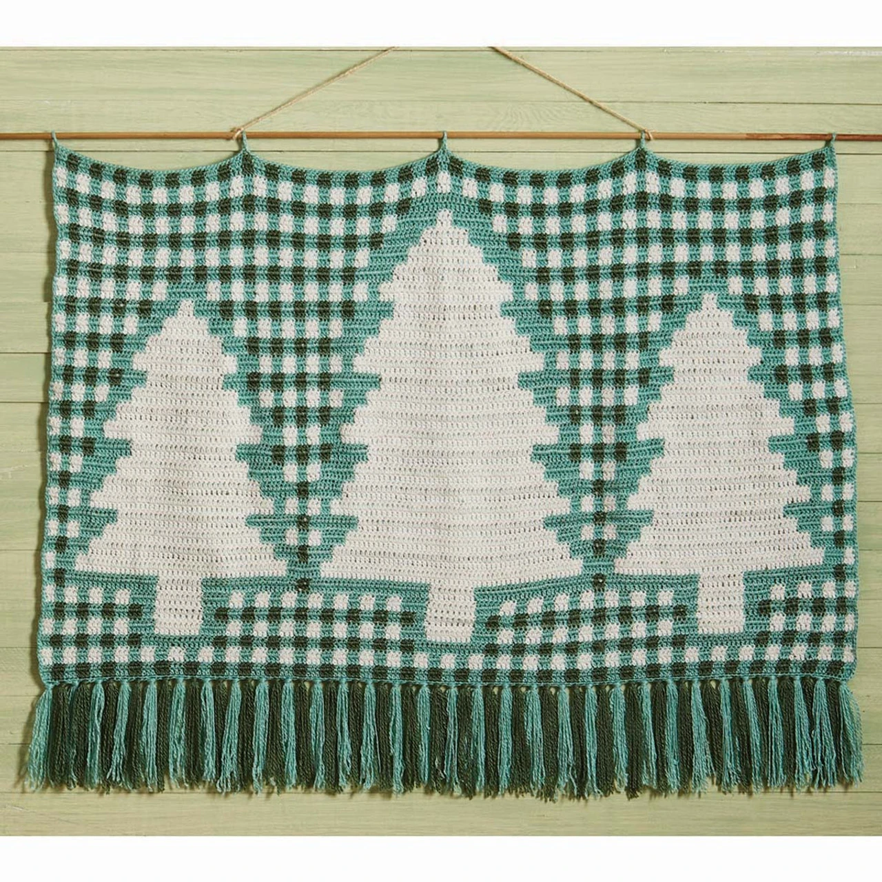 Deck your halls with a forest of trees silhouetted on plaid for a cozy Christmas atmosphere. Kit includes Herrschners 2-Ply Classic Afghan Yarn and intermediate crochet instructions. 33 × 20″ (84 x 51cm). Imported.