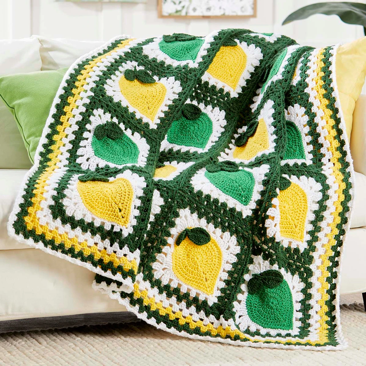 Add some zip to your décor with a bold citrus-themed afghan. This intermediate crochet afghan is created with a series of granny square-style motifs with a checkerboard pattern of lemon and lime motifs in green and yellow shades of Herrschners Worsted 8 yarn. A coordinating border around the grid of citrus fruits completes the look of this bright and bold afghan. Along with the yarn and intermediate crochet instructions, this afghan kit comes with a clear zippered storage bag, yarn needle, and a label for personalization. This 45 x 56″ (114 x 142cm) design requires a US size I-9 (5.5mm) hook to complete (not included). Imported.