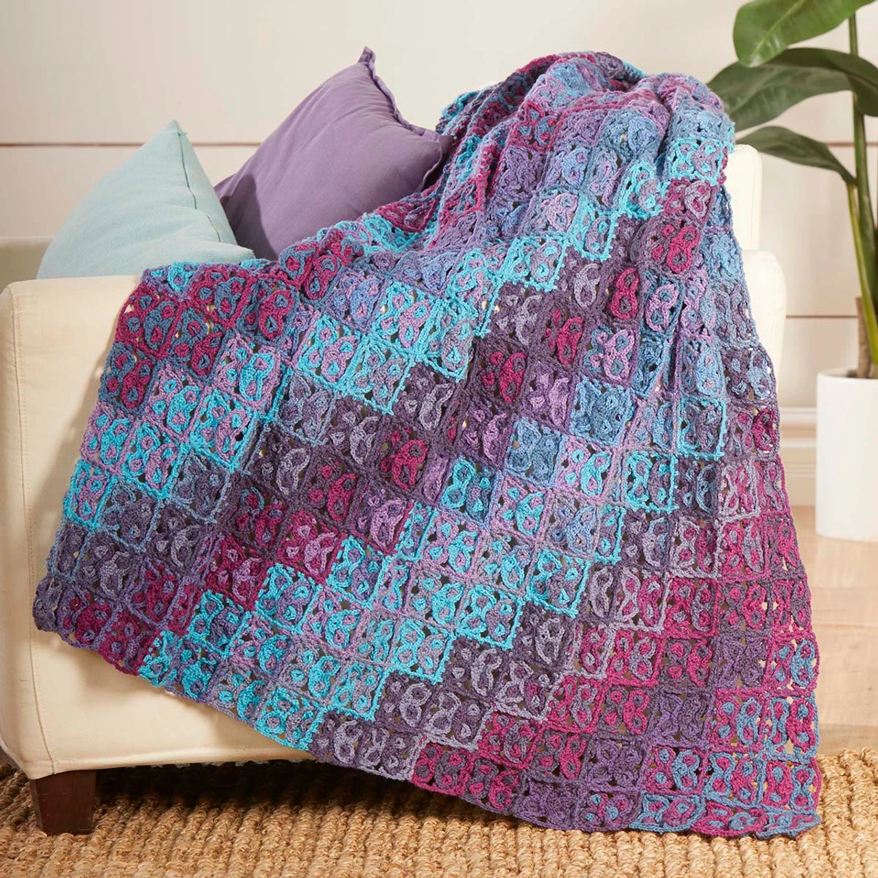 Create a beautiful mosaic-look blanket, crocheted with a clever use of self-striping Lion Brand Mandala yarn. Each square of this mesmerizing experienced crochet design is made from two “puzzle pieces” that fit together to create a stunning prismatic rainbow of color transitions from one corner to the next. This 40 x 53″ (102 x 135cm) design requires a US size F-5 (3.75mm) hook to complete (not included). Imported.