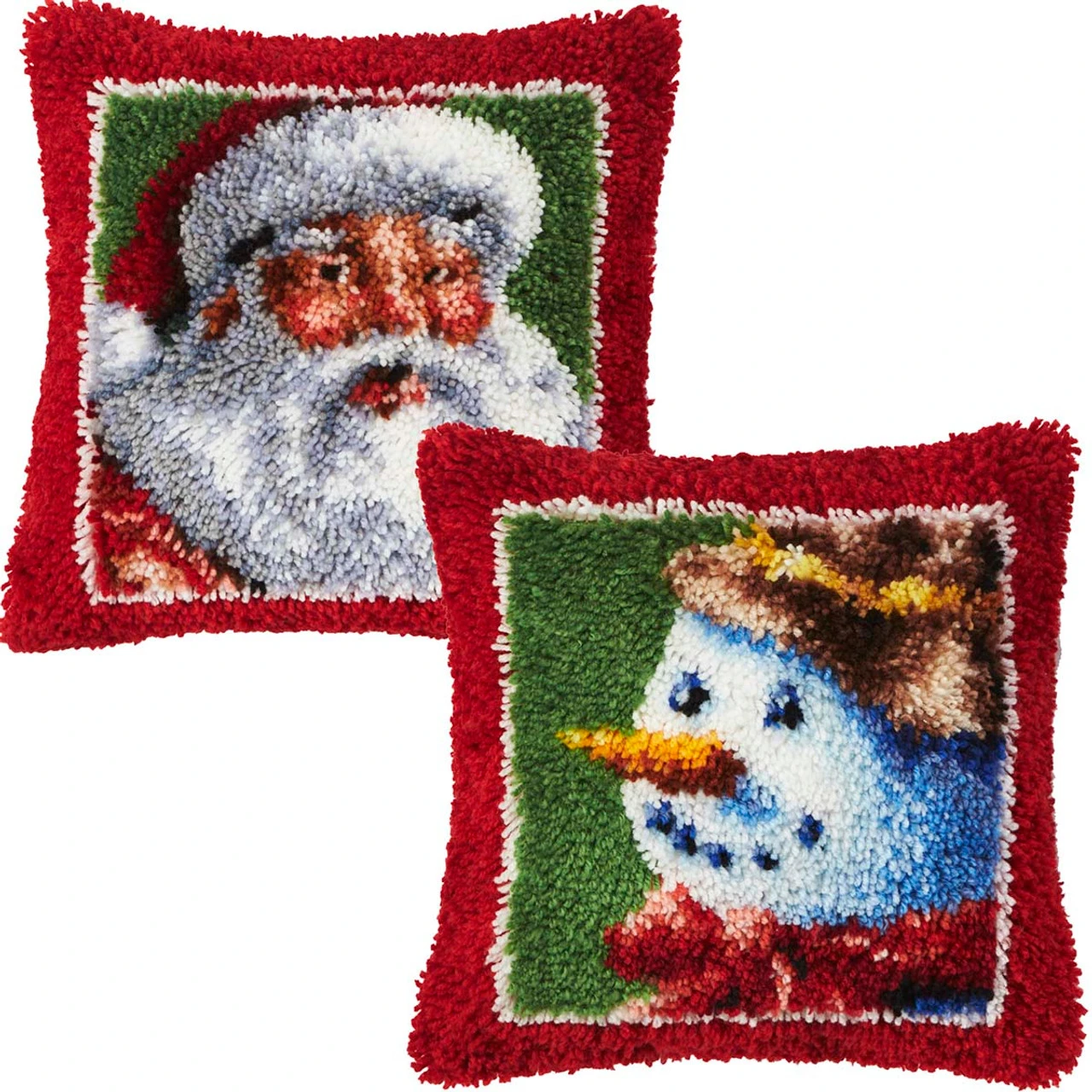 These Christmas latch hook pillows feature portraits of Santa Claus and a Snowman. The pair makes jolly holiday guests in your sitting area! Kit includes 3.75-mesh gridded canvas, lofty pre-cut 100% acrylic yarn, clear vinyl storage bag, easy-to-follow chart, and instructions. Latch hook tool, pillow backing, and pillow form are not included. The higher-gauge canvas of this project allows for a high level of detail in the finished design. Each finished pillow measures 16 x 16″ (41 x 41cm). Imported.