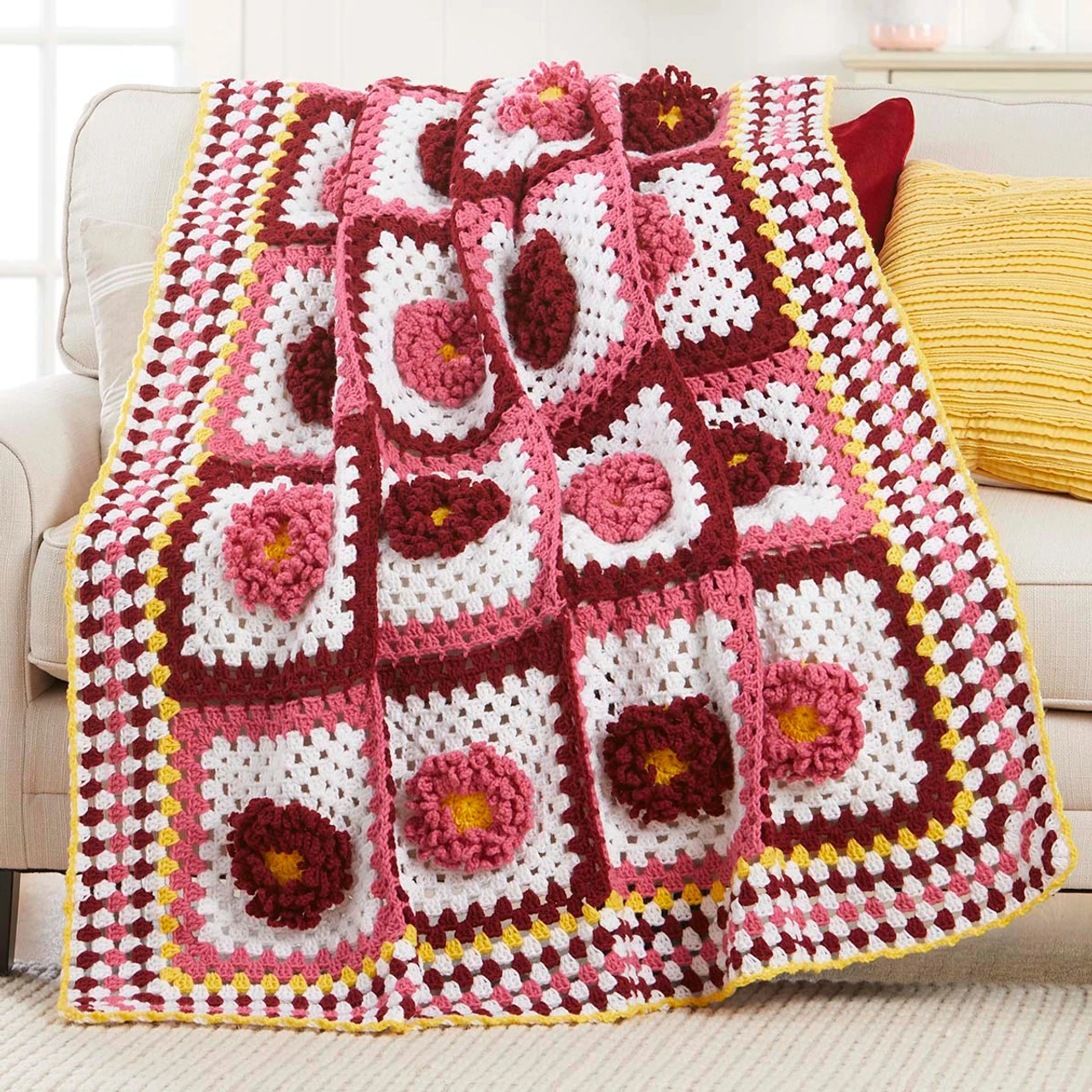 Snuggle under a garden of cheery flowers! This intermediate crochet afghan is created with a series of granny square-style motifs with 3D floral motifs in berry shades of Herrschners Worsted 8 yarn. A coordinating border around the grid of botanicals completes the look of this playful spring afghan. Along with the yarn and intermediate crochet instructions, this afghan kit comes with a clear zippered storage bag, yarn needle, and a label for personalization. This 45 x 56″ (114 x 142cm) design requires a US size I-9 (5.5mm) hook to complete (not included). Imported.